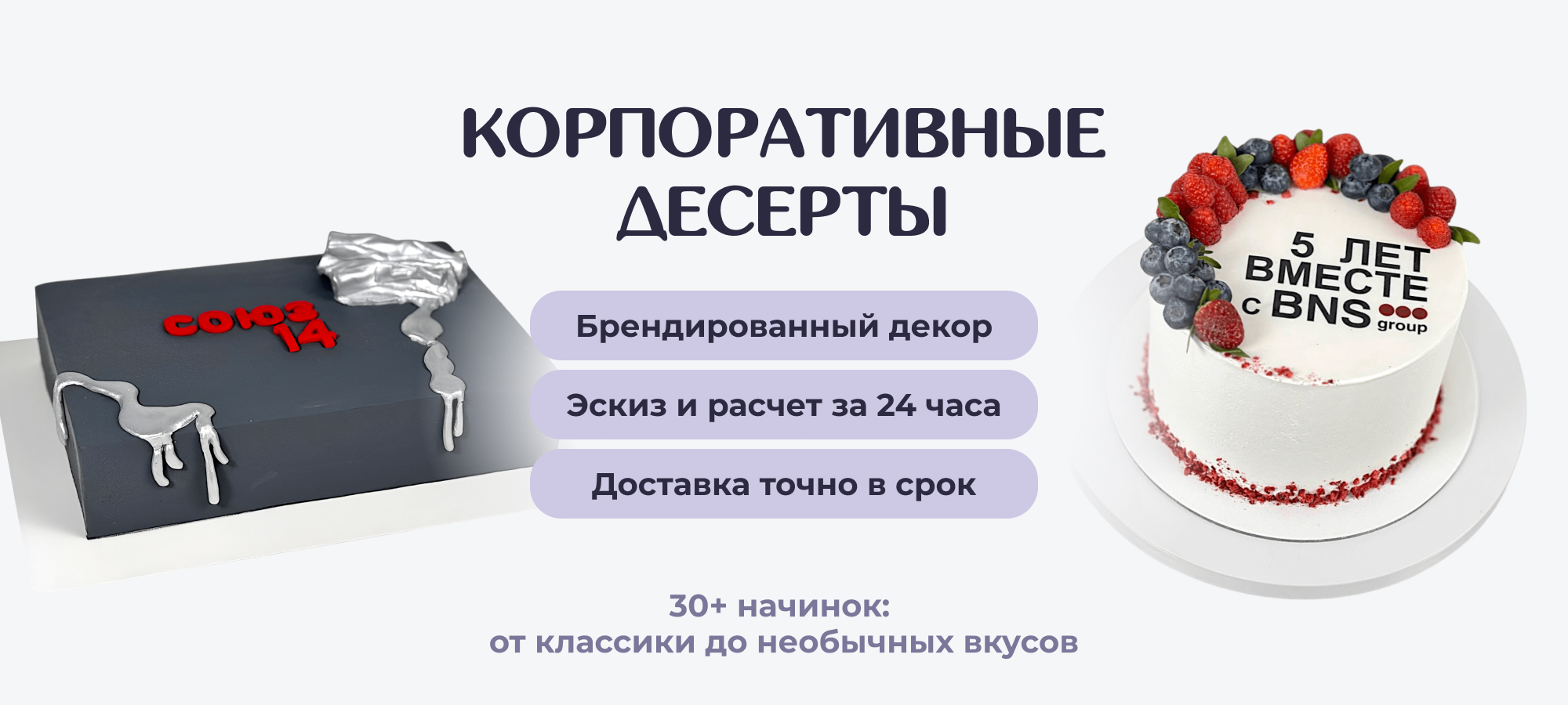 Корпоративный торт — это не просто десерт, а важный элемент бизнес-этикета. Мы создаем торты для директора, которые подчеркивают статус и хороший вкус, а также масштабные торты на корпоративные мероприятия. Точное воспроизведение фирменного стиля, 3D торты, строгие деловые дизайны или праздничные варианты для team building — каждый торт отражает ценности вашего бизнеса. Все десерты готовятся из премиальных ингредиентов, возможна разработка индивидуального дизайна по вашему техническому заданию.